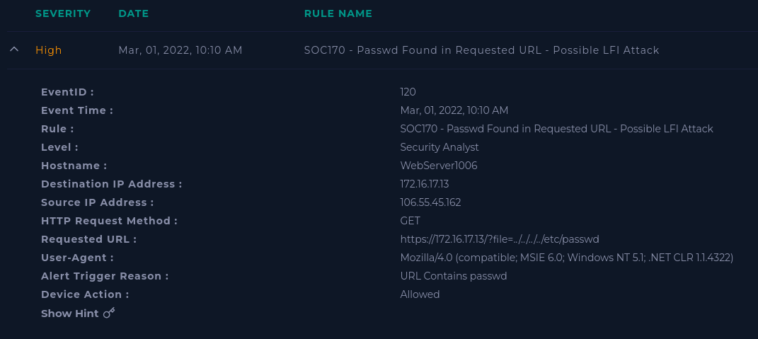 The evidence is right there in the alert, but let's go check the logs anyway. Go to Log Manaement and search for the source IP (106.55.45.162).